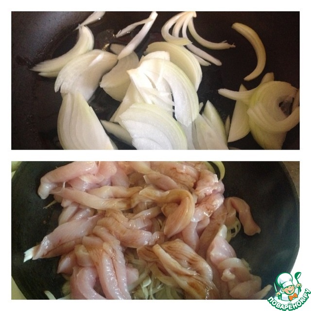 Лук нарезать полу кольцами и обжарить на растительном масле до мягкости. Грудку нарезать длинными, достаточно тонкими полосками и выложить к луку. Влить соевый соус. Обжарить вместе с луком минут 5-7 на достаточно сильном огне, при постоянном помешивании.