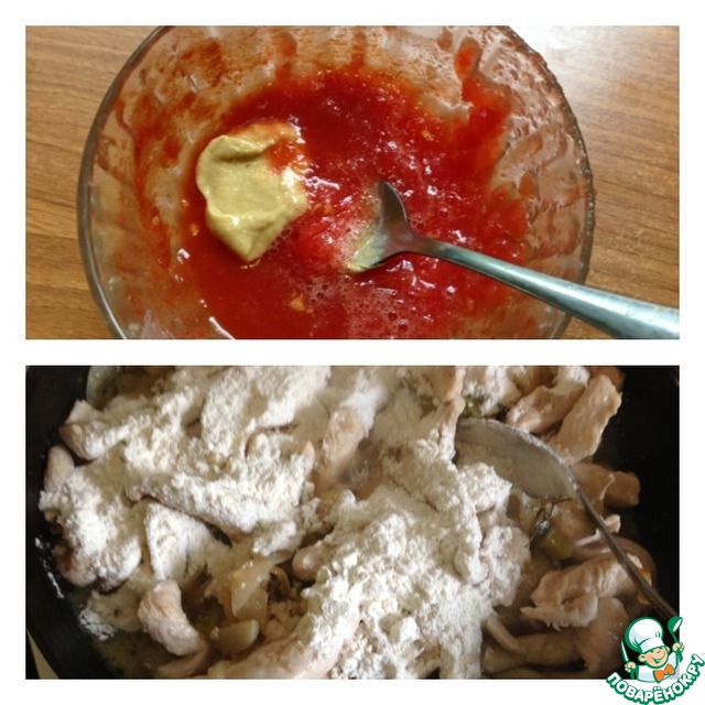 Помидоры натереть на крупной терке, добавить к ним горчицу ( у меня дижонская). Перемешать. Тем временем, к курочке добавить муку, и быстро перемешать, чтобы не было комочков.