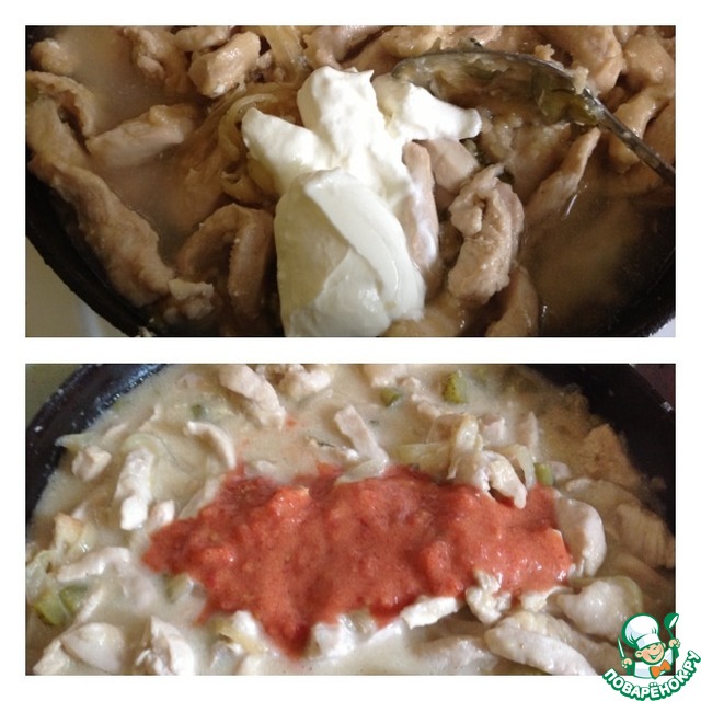 Сразу же добавить сметану и воду. Хорошо все перемешать. Густоту подливы регулируйте водой. Оставить покипеть курочку минуты на 3. Затем влить наш подготовленный натертый томат с горчицей. Перемешать и оставить протушиться курочку еще минуты на 3-4. Огонь выключить. Подавать с любимым гарниром.