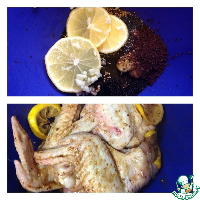 Выкладываем дольки лимона, сумах и чеснок пропущенный через пресс. Маринад перемешиваем и выкладываем наши крылышки. Тщательно обмазываем маринадом, чуть "жулькая" руками. Оставляем курочку минимум на час для маринования.