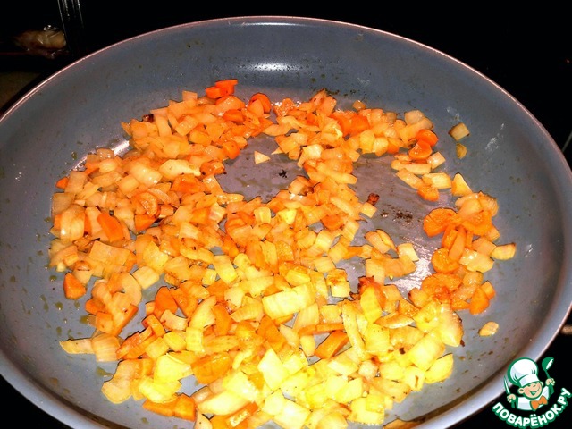 В этой же сковороде обжариваем немного лук и добавляем мелко нарезанную морковь, всё это обжариваем вместе