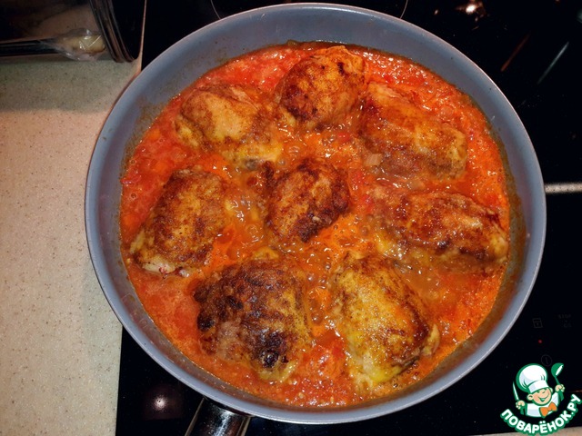 Берем нашу подготовленную курочку и выкладываем в овощной соус (кстати соус мы не солим), накрываем крышкой и тушим до готовности курицы. Соус загустеет и получится замечательным дополнением к гарниру
