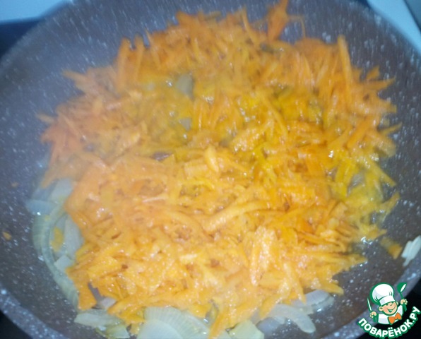 В сковороде разогреть растительное масло и обжарить лук с морковью 1-2 минуты.