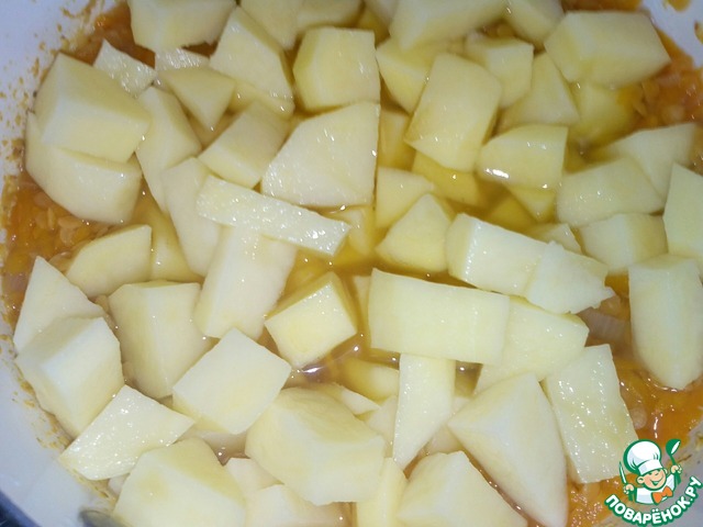 Через 5 минут добавить картофель и тушить ещё 10 минут.
