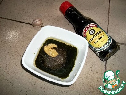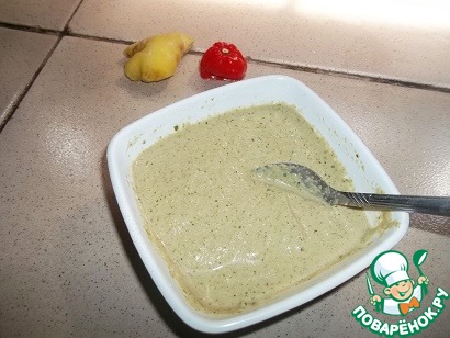 Свежую зелень измельчить с помощью блендера. Смешать 1 ст. л. измельченной зелени, пропущенный через пресс чеснок, соевый соус, горчицу, растительное или оливковое (по вкусу) масло и смесь перцев.