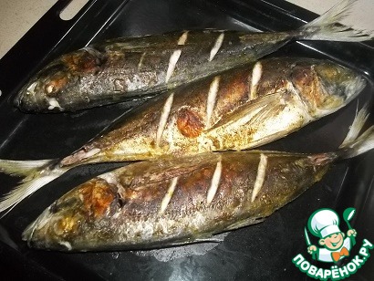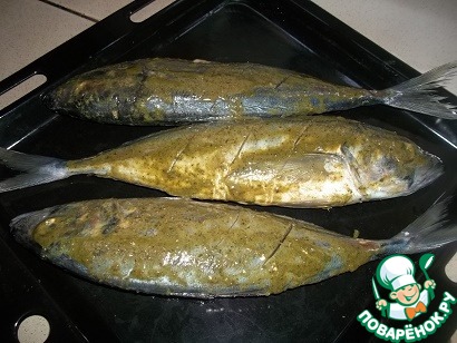 Рыбу можно взять практически любую, не костлявую. В моем случае скумбрия, 3 тушки весом по 600г примерно. Рыбу выпотрошить (если с чешуей, то сначала очистить от чешуи), надрезать брюшко, вынуть через него внутренности, удалить жабры, если готовите с головой. Тщательно промыть. Сделать несколько неглубоких надрезов наискосок для того, чтобы кожа не полопалась при запекании и чтобы маринад лучше впитался в мякоть. Рыбу обязательно подкислить, то есть хорошо сбрызнуть уксусом (или лимонным соком по желанию) внутри и снаружи. Чуть посолить, так как маринад тоже соленый.