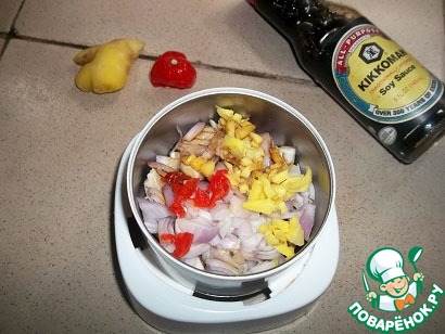 Приготовить соус. Лук, зелень, кусочек имбиря, немного острого перца нарезать. Поместить в маленькую чашу блендера. Добавить соевый соус, горчицу, майонез, смесь перцев.
