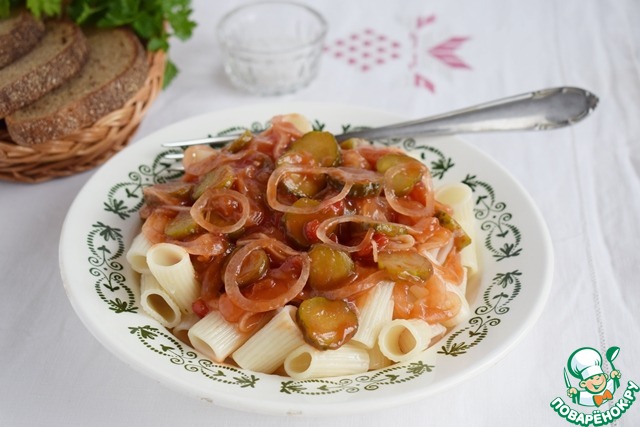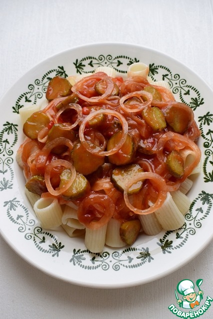 Пока варятся макароны, приготовим заправку: маринованные огурцы нарежем кружочками, лук тонко нашинкуем, добавим вкусный томатный соус и растительное масло. Перемешаем всю эту красоту, если нужно добавим сахар по вкусу.