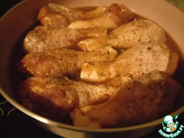 2 ст. л чайной заварки залить кипятком, настоять. Куриные голени промыть, обсушить. В настоявшийся чай добавить соевый соус и мед, тщательно перемешать. Для нас хватает соли в соусе, а вы пробуйте. Добавить специи, у меня черный перец и сухой базилик. В этот маринад уложить голени, берите емкость глубокую, сверху гнёт. Оставляем на 1,5- 2 часа, пару раз перевернуть, что бы лучше пропиталось,