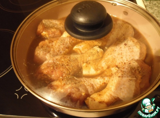 укладываем мясо в глубокую сковороду или сотейник. Заливаем маринадом (тот в котором вымачивались голени), присыпаем специями - паприка, перец хлопьями и т. д. по вкусу.