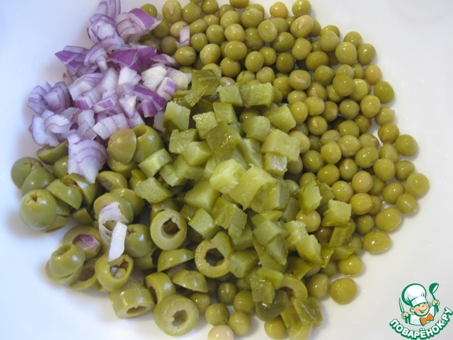 В миску выложим горошек, оливки порежем колечками, огурец и лук кубиком