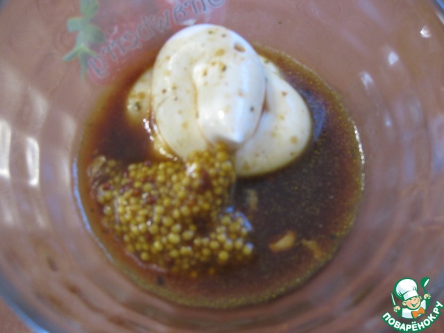 Готовую грудку выложим на тарелку остужать, тем временем приготовим заправку, - майонез, горчицу и 2 ст. ложки сока от жарки курицы