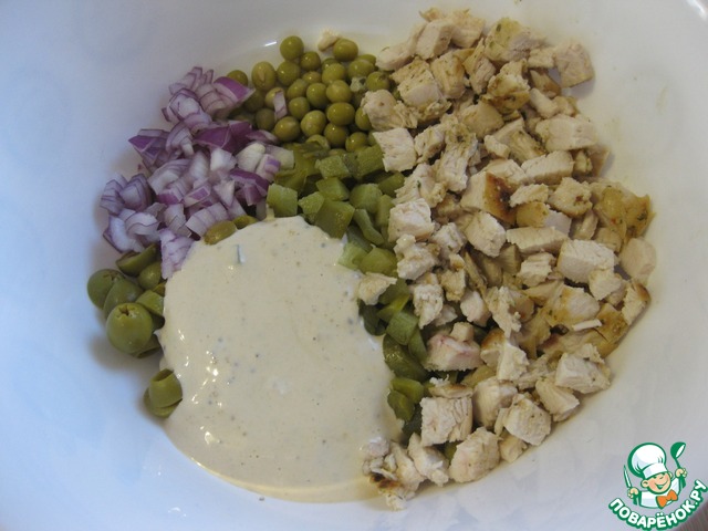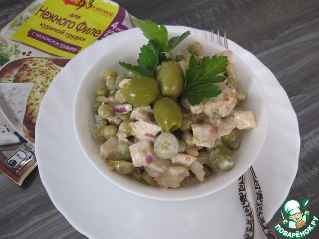 | Совершенно простой в исполнении и по составу салатик, но при этом очень вкусный и сочный! Нежная грудка, обжаренная в листах Магги с травами и чесноком, пикантные оливки, хрустящий огурчик и красный лук, а также зеленый горошек, - конечный результат меня порадовал своим вкусом, - заходите, будем пробовать! |