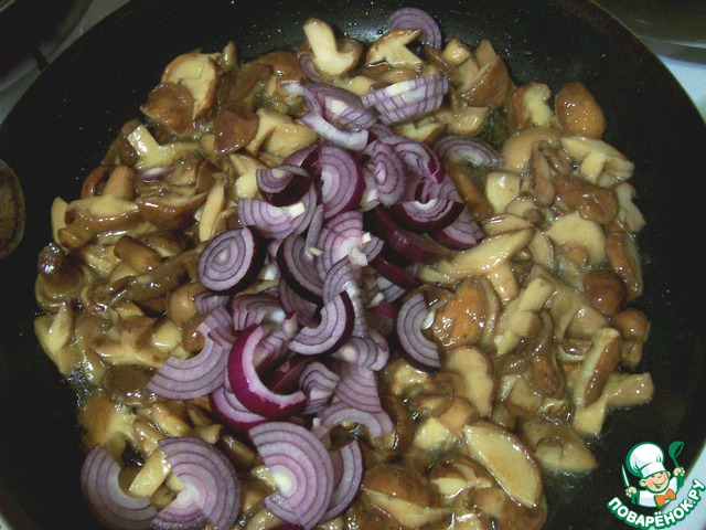 Добавляем к грибам нарезанный полукольцами красный репчатый лук, присаливаем, жарим до готовности лука, периодически помешивая.
