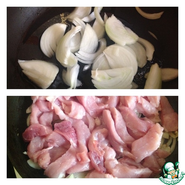 Лук нарезать полу кольцами и поставить обжаривать на растительном масле до мягкости. Затем не убавляя огонь, добавить мясо нарезанное тонкими длинными полосками. Перемешать, и жарить до легкого зарумянивания мяса.