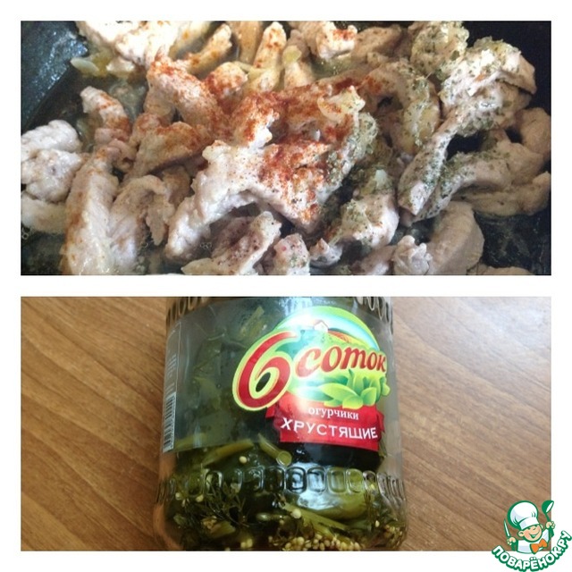 Когда мясо зарумянилось и жидкость вся выпарилась, добавить рассол из под огурчиков. Всыпать все специи. Перемешать, огонь убавить на минимальный. Оставить тушиться мясо минут на 20-30.