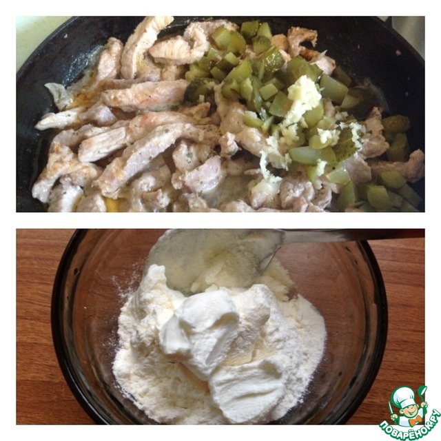 Через 20-30 минут добавить к мясу нарезанные кубиком маринованные огурчики и чеснок пропущенный через пресс. В холодную сметану добавить муку, хорошо перемешать.