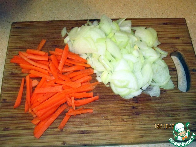 Чистим и нарезаем 1 морковь и 2 луковицы.