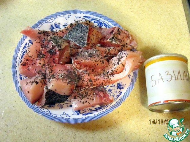 Вырезаем хребет и формируем рыбу средними кусками. Солим и посыпаем 0,5 ч. л. сушеным базиликом. Оставляем на 10 минут.