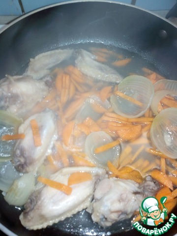 Через 30 минут добавляем нарезанную морковь к крыльям. Доводим до кипения и тушим на медленном огне 10 минут.