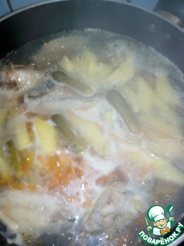 Теперь добавляем картофель и огурчики. Также доводим до кипения и тушим на медленном огне еще 5 минут.