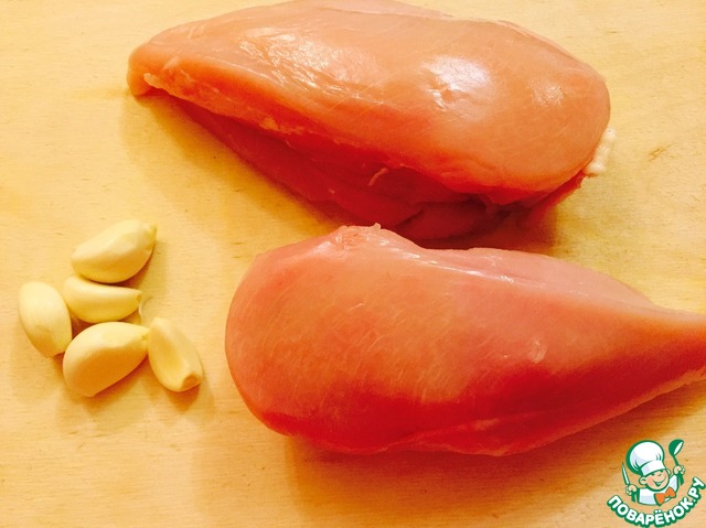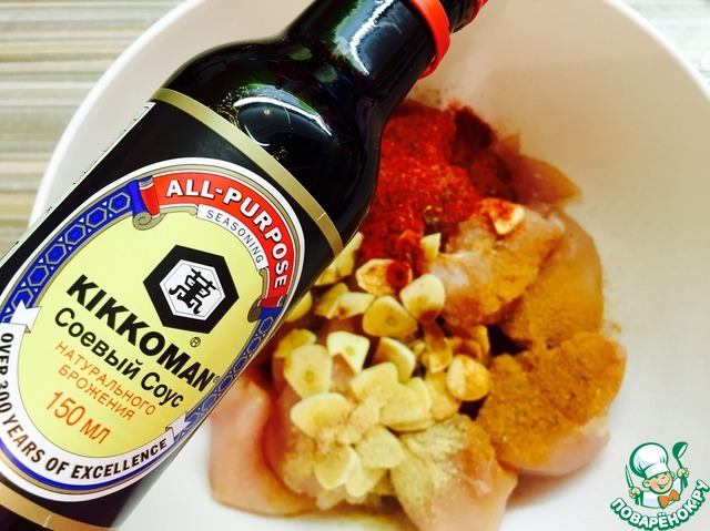К куриному филе добавляем чеснок, соевый соус, паприку, перец, и имбирь