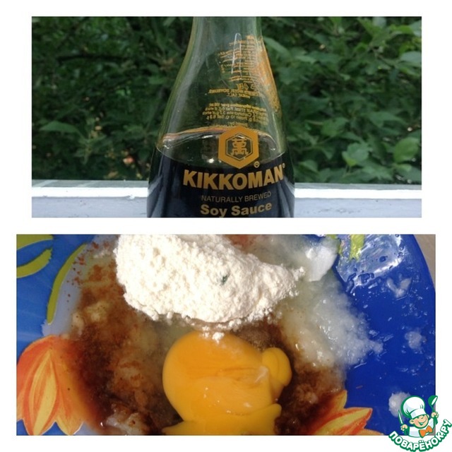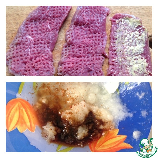 Мясо нарезать тонкими пластами, сразу присолить и отбить с двух сторон. Намазать горчицей отбивные с двух сторон и оставить на пол часа в холодильнике. Тем временем: лук натереть на мелкой терке, чеснок пропустить через пресс. Добавить соевый соус и аджику.