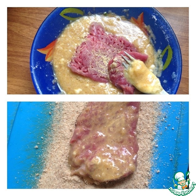 Сковороду хорошо разогреть, добавить растительное масло. Каждую отбивную тщательно обмакнуть в луковый кляр, затем обвалять в сухарях.