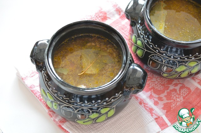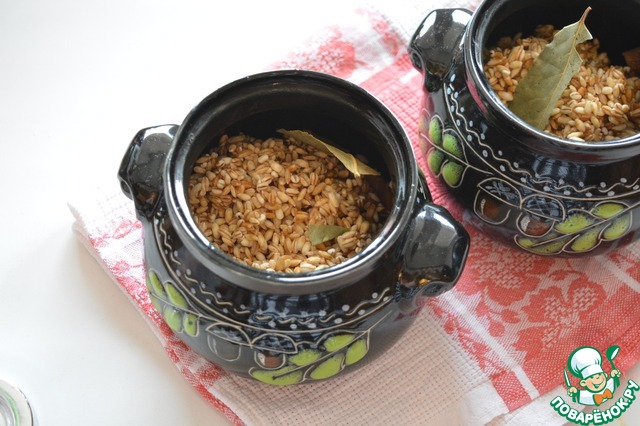 С перловки слейте воду и разложите её в горшочки, добавьте соль по вкусу, лавровый лист
