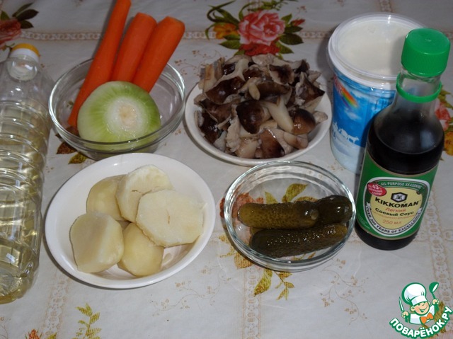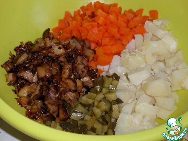 Подготавливаем продукты. Отвариваем овощи в слегка подсоленной воде. остужаем и очищаем. Грибы отвариваем в слегка подсоленной воде 30 минут и остужаем.