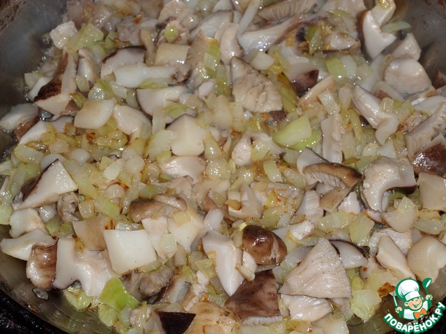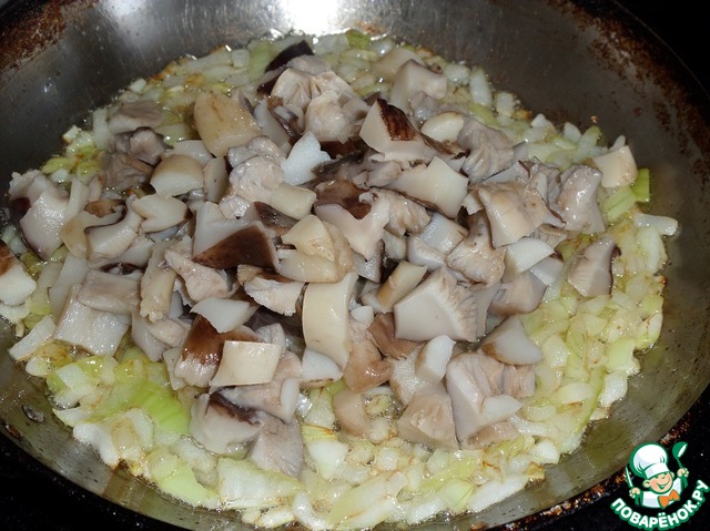 В сковороду к обжаренному луку добавляем нарезанные грибы.