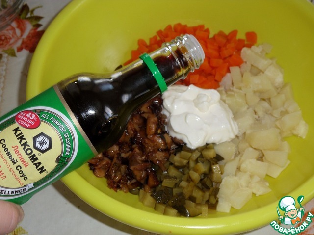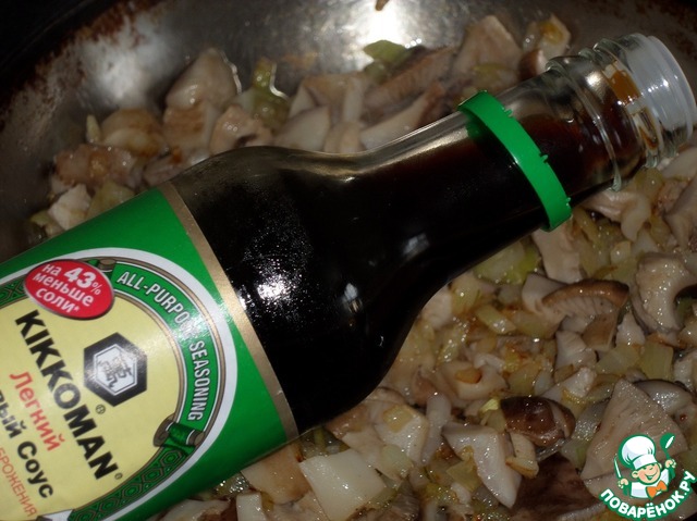 Добавляем 2 ст. л. соевого соуса. Я использую соевый соус "Легкий" ТМ "Kikkoman".