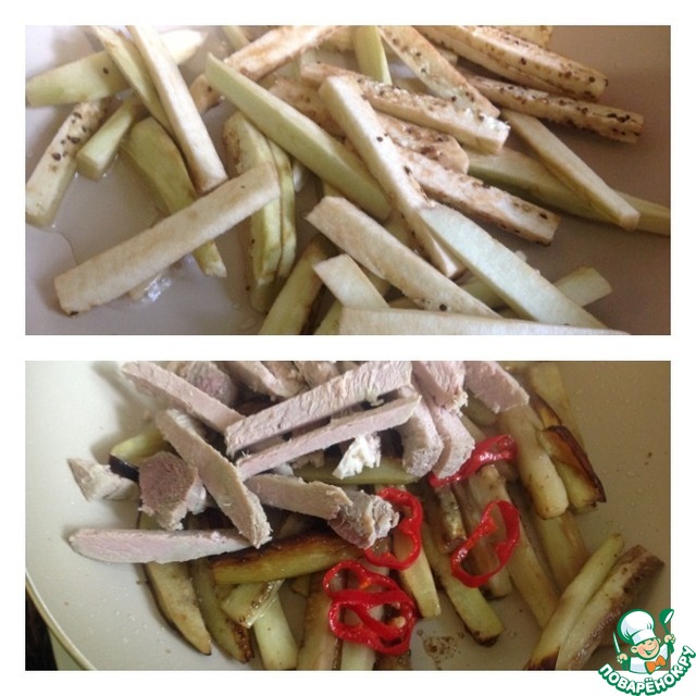 Баклажан очистить и нарезать брусочками. Поставить обжаривать в небольшом количестве растительного масла. Когда баклажан станет уже мягким, добавить к нему отварную свинину порезанную брусочками. Острый перец ( мы от семян не чистим) порезать колечками и добавить туда же. Перемешать и обжаривать до готовности баклажан.