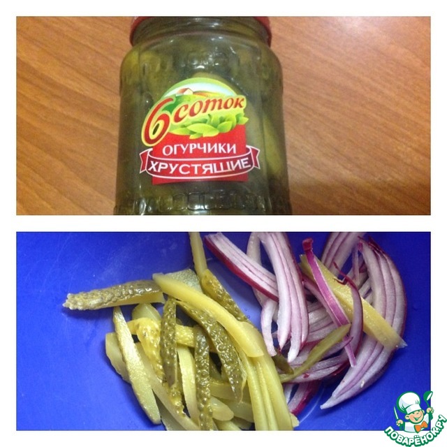 Тем временем нарезать соломкой огурчики, лук полу кольцами потоньше.