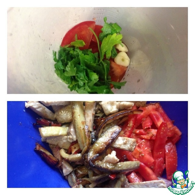 Помидор 1 шт порезать полосками, добавить специи и уже остывшие баклажаны с мясом. Со второго помидора снять кожицу, порезать произвольно и выложить в чашу блендера. Туда же отправить зубчик чеснока, зелень, оливковое масло и уксус. Взбить нашу будущую заправку для салата в однородную массу.