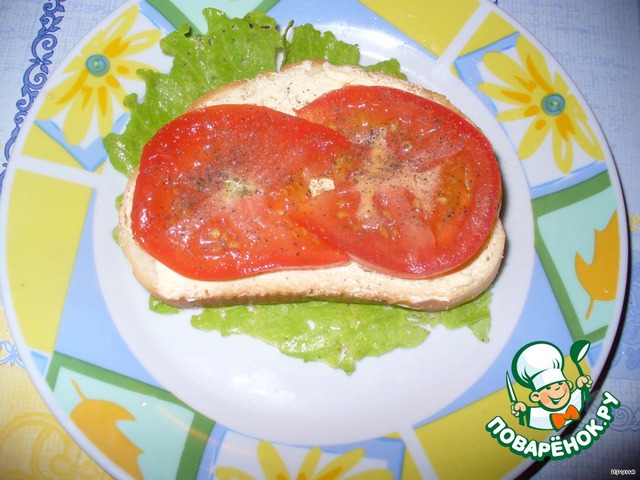 Помидор разрезать на кружочки и положить на хлеб с маслом. Сверху опять посолить и поперчить. Всё! Приятного аппетита!