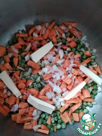 Сливочное масло распределить сверху, залить водой, чтобы немного покрывала горох, по желанию посолить и поперчить. Закрыть крышку скороварки и поставить варится на 10 минут с момента закипания.