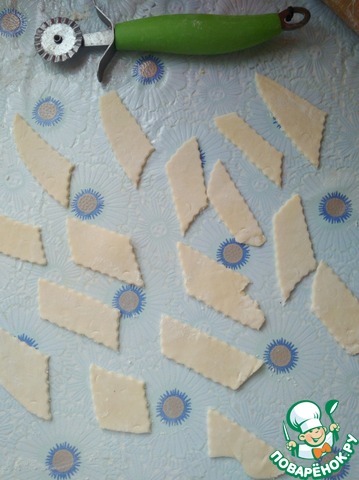 Тесто раскатать в тонкий пласт и разрезать на куски произвольной формы (можете по желанию помельче или покрупнее).