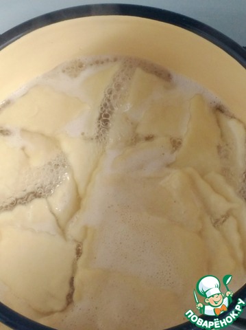А тем временем, пока жарится лук с филе, отварить кусочки теста в подсоленной воде до готовности.