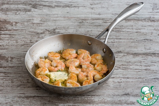 На лимонном масле обжарьте лук вместе с мелко нарезанным чесноком и хлопьями красного перца. Выложите креветки и обжарьте с обеих сторон до розового цвета. Готовые креветки переложите на тарелку. В ту же сковороду залейте сливки, доведите до кипения. уменьшите огонь и готовьте до загустения около 5 минут) Снимите с огня.