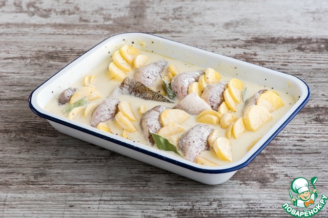Смажьте сливочным маслом глубокую форму и выкладывайте слоями: рыбу, картофель, снова рыбу, лавровый лист, каждый слой солите и перчите. Сверху должен остаться слой картошки.