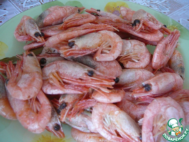 Отварить креветки в подсоленой воде, у меня очищенных не было, поэтому очищаю.