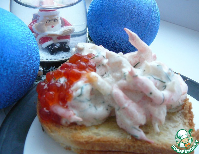 Выложить на ломтики креветки. Украсить красной икрой и оставшимся укропом.