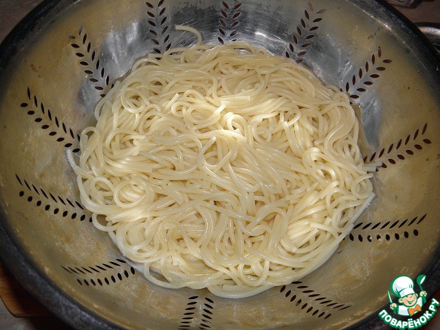 Макароны отварить в подсоленной воде, откинуть на дуршлаг