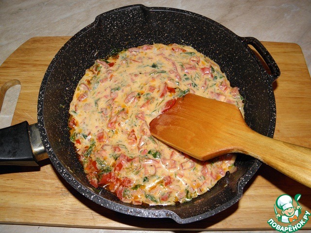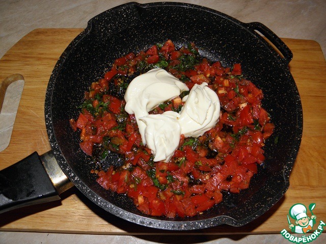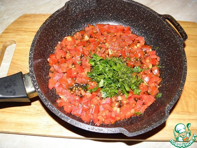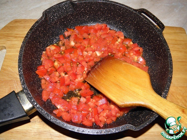 Помидоры нарезать мелкими кубиками, в сковороде разогреть растительное масло и обжарить помидоры минуты 3