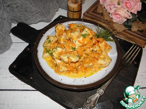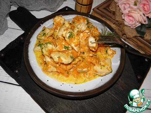 Добавляем к курице с морковью сметану, мелко нарезанную зелень, измельченный чеснок