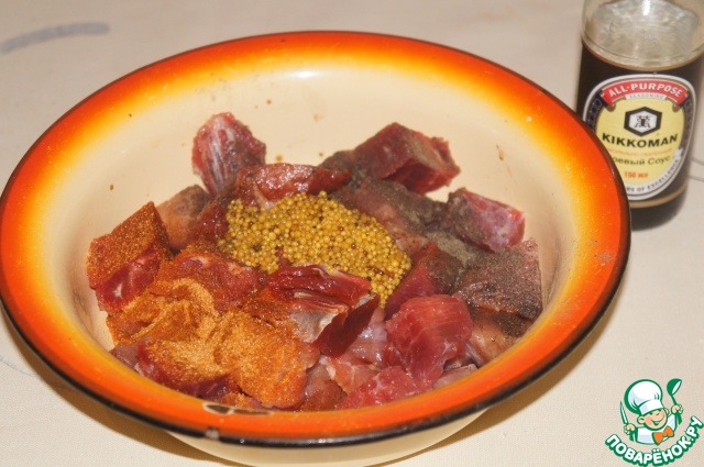 Телятину нарезать на небольшие кусочки, добавить соевый соус, горчицу, немного соли, перец и приправу по вкусу.