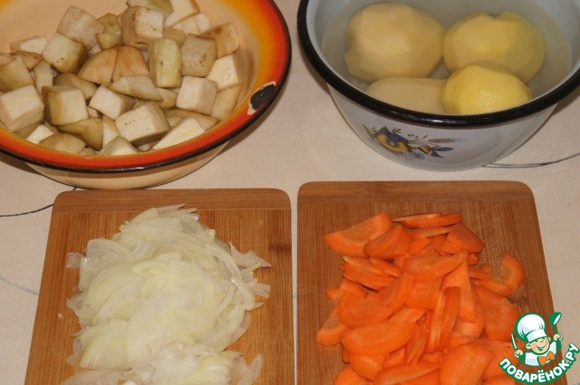 Тем временем вымыть и очистить овощи. Баклажаны и картофель нарезать кубиками, морковь – полуколечками, лук – соломкой.