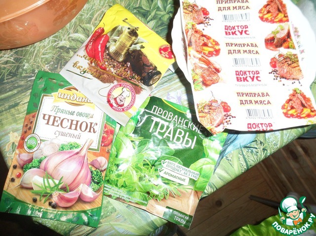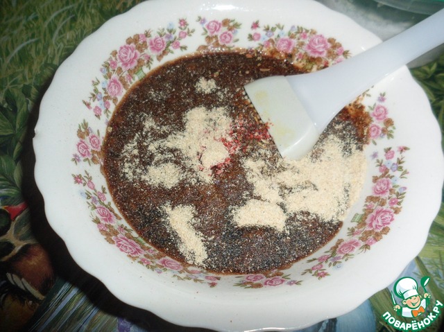 К приправам добавить соевый соус и перемешать (количество соуса варьировать до нужной густоты), я использовала по целому пакету для мяса и чеснока, остальное по-немногу