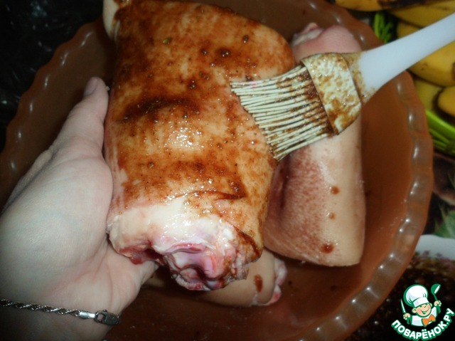 Обмазать рульки готовой смесью и сразу складывать в пакет для запекания, туда же добавить воду